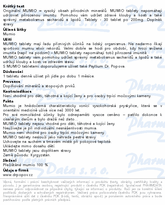 Originální MUMIO = vysoký obsah přírodních minerálů. MUMIO tablety napomáhají udržovat přirozenou imunitu. Pomohou vám udržet zdravé klouby a kosti a také správný metabolismus sacharidů a lipidů. Tablety - 30 tablet po 200mg. Doplněk stravy.