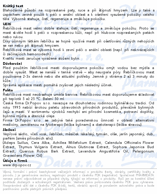 Blahodárně působí na rozpraskané paty, ruce a při štípnutí hmyzem. Lze ji také s úspěchem zevně použít k péči o anální oblast a k ošetření vysušené pokožky celého těla. Výborně stahuje, čistí, regeneruje a změkčuje pokožku.