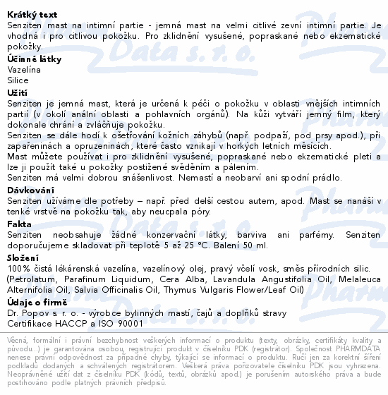 Senziten mast na intimní partie - jemná mast na velmi citlivé zevní intimní partie. Je vhodná i pro citlivou pokožku. Pro zklidnění vysušené, popraskané nebo ekzematické pokožky.