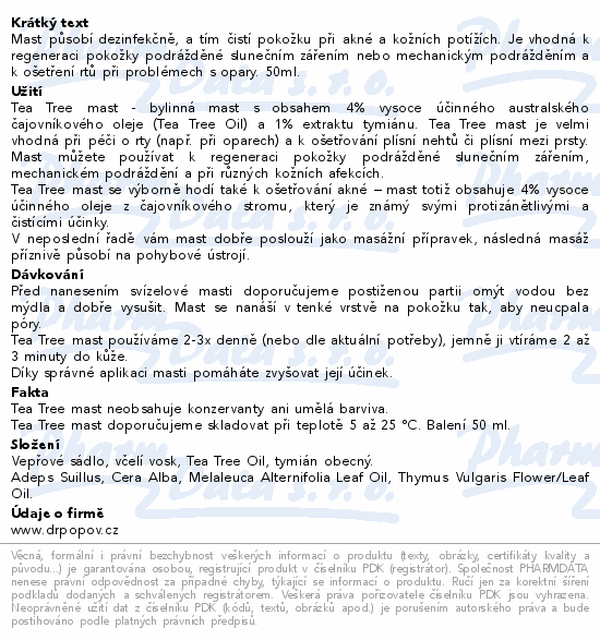Mast působí dezinfekčně, a tím čistí pokožku při akné a kožních potížích. Je vhodná k regeneraci pokožky podrážděné slunečním zářením nebo mechanickým podrážděním a k ošetření rtů při problémech s opary. 50ml.