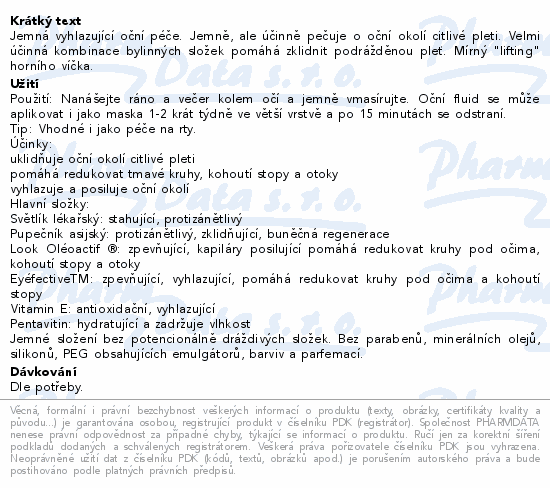 Jemná vyhlazující oční péče. Jemně, ale účinně pečuje o oční okolí citlivé pleti. Velmi účinná kombinace bylinných složek pomáhá zklidnit podrážděnou pleť. Mírný "lifting" horního víčka.