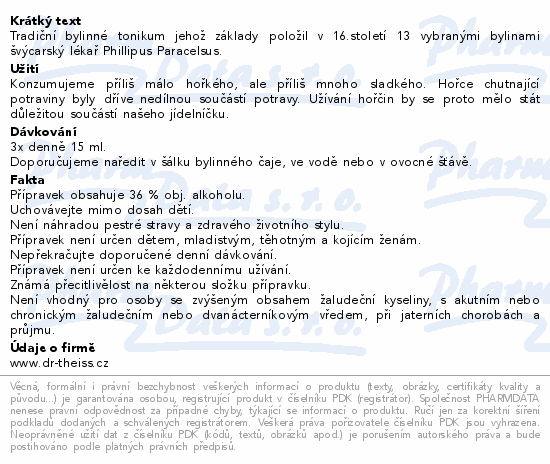 Tradiční bylinné tonikum jehož základy položil v 16.století 13 vybranými bylinami švýcarský lékař Phillipus Paracelsus.
