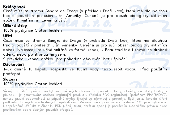Čistá míza se stromu Sangre de Drago (v překladu Dračí krev), která má dlouholetou tradici použití v pralesích Jižní Ameriky. Ceněná je pro obsah biologicky aktivních složek. K vnitřnímu i zevnímu užití.
