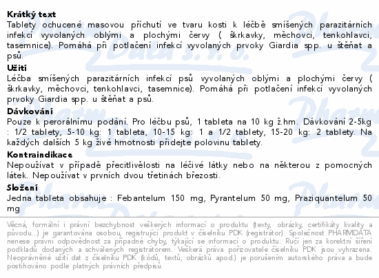 Tablety ochucené masovou příchutí ve tvaru kosti k léčbě smíšených parazitárních infekcí vyvolaných oblými a plochými červy ( škrkavky, měchovci, tenkohlavci, tasemnice). Pomáhá při potlačení infekcí vyvolaných prvoky Giardia spp. u štěňat a psů.