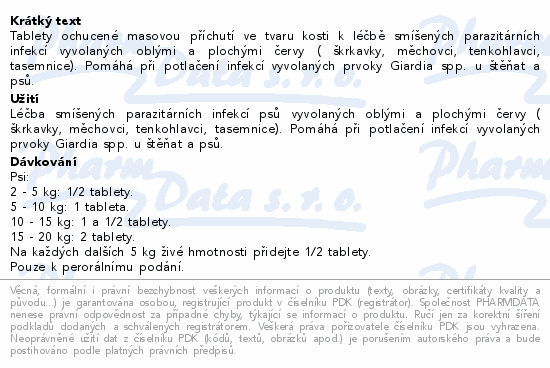 Tablety ochucené masovou příchutí ve tvaru kosti k léčbě smíšených parazitárních infekcí vyvolaných oblými a plochými červy ( škrkavky, měchovci, tenkohlavci, tasemnice). Pomáhá při potlačení infekcí vyvolaných prvoky Giardia spp. u štěňat a psů.