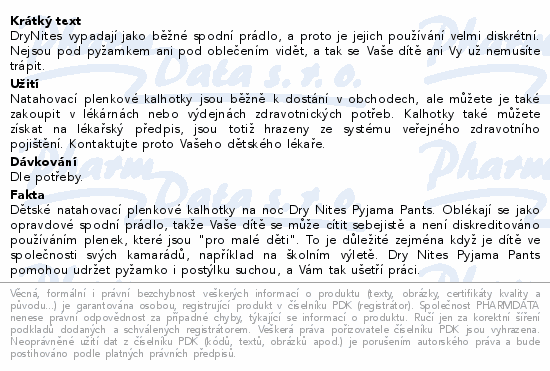 DryNites vypadají jako běžné spodní prádlo, a proto je jejich používání velmi diskrétní. Nejsou pod pyžamkem ani pod oblečením vidět, a tak se Vaše dítě ani Vy už nemusíte trápit.