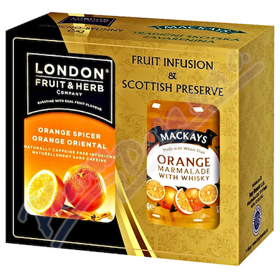 Dárková sada s oblíbeným ovocným čajem London Herb s příchutí pomeranč se skořicí a pomerančovou zavařeninou Mackays s přídavkem skotské whisky (3%).