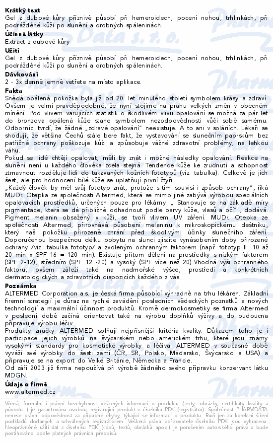 Gel z dubové kůry příznivě působí při hemeroidech, pocení nohou, trhlinkách, při podrážděné kůži po slunění a drobných spáleninách.