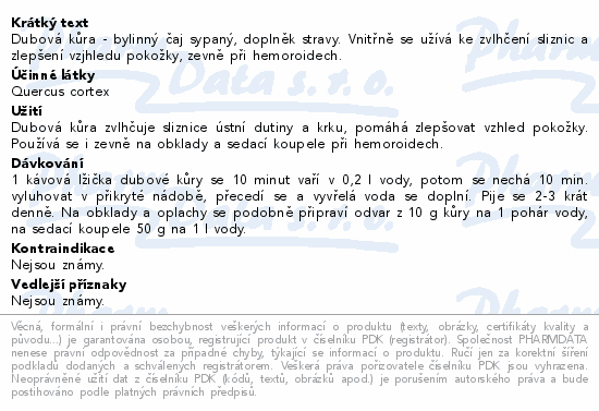 Dubová kůra - bylinný čaj sypaný, doplněk stravy. Vnitřně se užívá ke zvlhčení sliznic a zlepšení vzjhledu pokožky, zevně při hemoroidech.