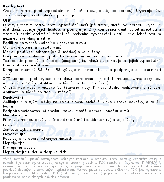 Creastim roztok proti vypadávání vlasů (při stresu, dietě, po porodu). Urychluje růst vlasů. Zvyšuje hustotu vlasů a posiluje je.
