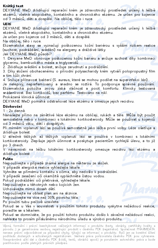 DEXYANE MeD zklidňující reparační krém je zdravotnický prostředek určený k léčbě ekzémů, včetně atopického, kontaktního a chronického ekzému. Je určen pro kojence od 3 měsíců, děti a dospělé. Na obličej, tělo i ruce.