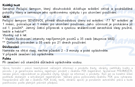 Sensinol Pečující šampon, který dlouhodobě zklidňuje svědění citlivé a podrážděné pokožky hlavy a zamezuje jeho opětovnému výskytu i po ukončení používání.