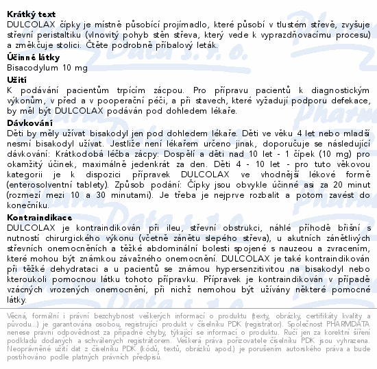 DULCOLAX čípky je místně působící projímadlo, které působí v tlustém střevě, zvyšuje střevní peristaltiku (vlnovitý pohyb stěn střeva, který vede k vyprazdňovacímu procesu) a změkčuje stolici. Čtěte pozorně příbalový leták.