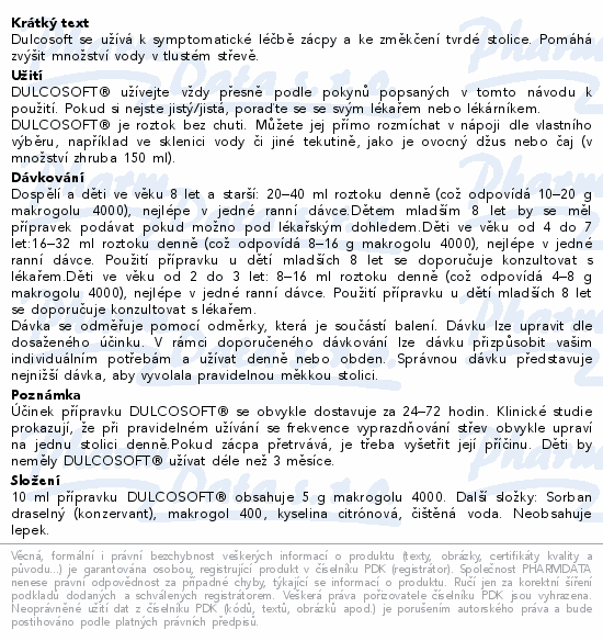 Dulcosoft se užívá k symptomatické léčbě zácpy a ke změkčení tvrdé stolice. Pomáhá zvýšit množství vody v tlustém střevě.