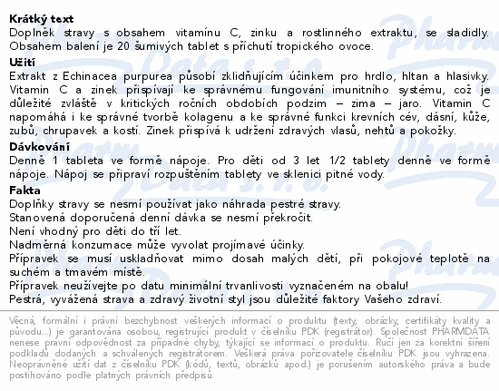 Doplněk stravy s obsahem vitamínu C, zinku a rostlinného extraktu, se sladidly. Obsahem balení je 20 šumivých tablet s příchutí tropického ovoce.
