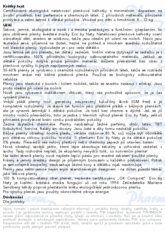 Certifikované ekologické natahovací plenkové kalhotky s minimálním dopadem na životní prostředí, bez parfemace a chemických látek. Z přírodních materiálů, přirozeně prodyšné a velmi šetrné k dětské pokožce. Vhodné pro děti o hmotnosti 8 - 15 kg.