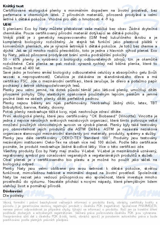 Certifikované ekologické plenky s minimálním dopadem na životní prostředí, bez parfemace a chemických látek. Z přírodních materiálů, přirozeně prodyšné a velmi šetrné k dětské pokožce. Vhodné pro děti o hmotnosti 4 -9 kg.