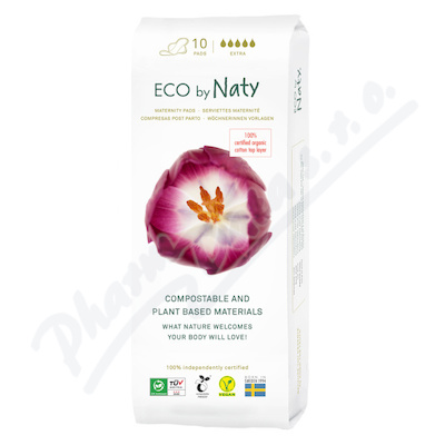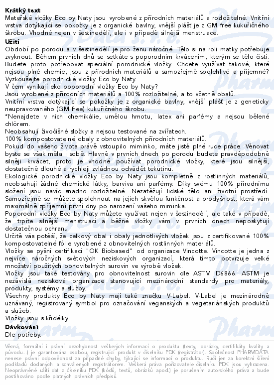 Mateřské vložky Eco by Naty jsou vyrobené z přírodních materiálů a rozložitelné. Vnitřní vrstva dotýkající se pokožky je z organické bavlny, vnější plášť je z GM free kukuřičného škrobu. Vhodné nejen v šestinedělí, ale i v případě silnější menstruace.
