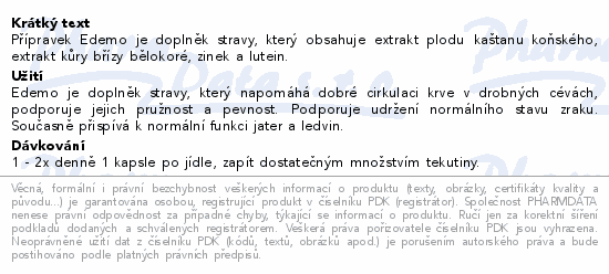 Přípravek Edemo je doplněk stravy, který obsahuje extrakt plodu kaštanu koňského, extrakt kůry břízy bělokoré, zinek a lutein.