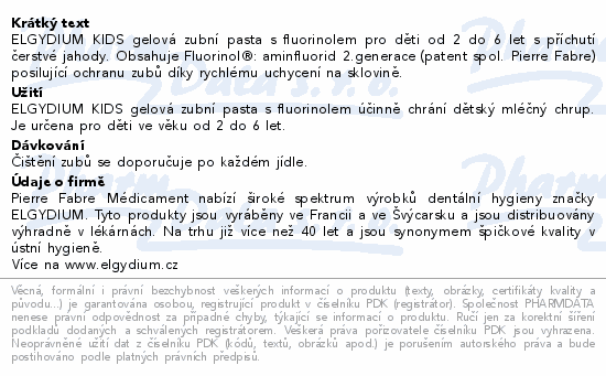 ELGYDIUM KIDS gelová zubní pasta s fluorinolem pro děti od 2 do 6 let s příchutí čerstvé jahody. Obsahuje Fluorinol®: aminfluorid 2.generace (patent spol. Pierre Fabre) posilující ochranu zubů díky rychlému uchycení na sklovině.