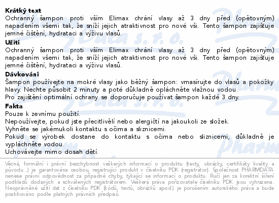Ochranný šampon proti vším Elimax chrání vlasy až 3 dny před (opětovným) napadením všemi tak, že sníží jejich atraktivnost pro nové vši. Tento šampon zajišťuje jemné čištění, hydrataci a výživu vlasů.