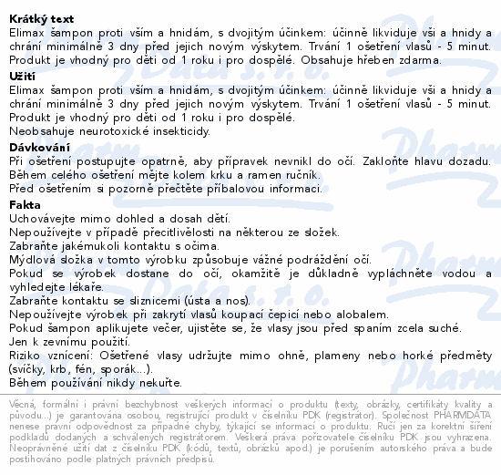 Elimax šampon proti vším a hnidám, s dvojitým účinkem: účinně likviduje vši a hnidy a chrání minimálně 3 dny před jejich novým výskytem. Trvání 1 ošetření vlasů - 5 minut. Produkt je vhodný pro děti od 1 roku i pro dospělé. Obsahuje hřeben zdarma.
