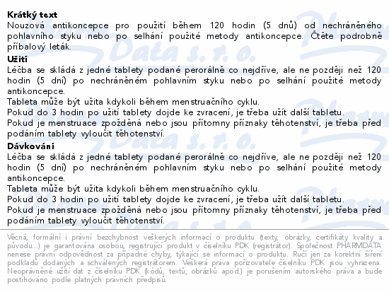 Nouzová antikoncepce pro použití během 120 hodin (5 dnů) od nechráněného pohlavního styku nebo po selhání použité metody antikoncepce. Čtěte pozorně příbalový leták.