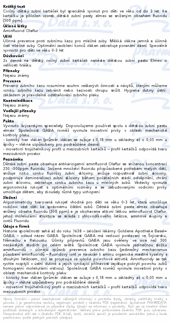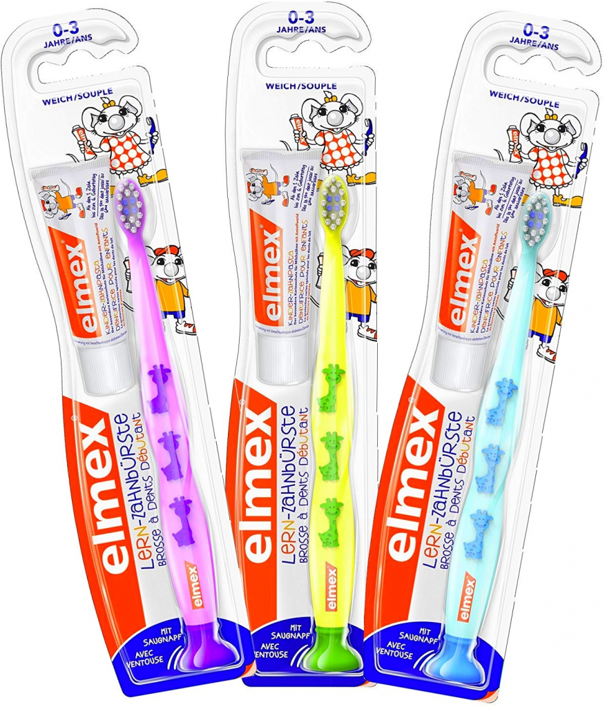 Cvičný dětský zubní kartáček byl speciálně vyvinut pro děti ve věku od 0 do 3 let. Ke kartáčku je přiložen vzorek dětské zubní pasty elmex se sníženým obsahem fluoridu (500 ppm).