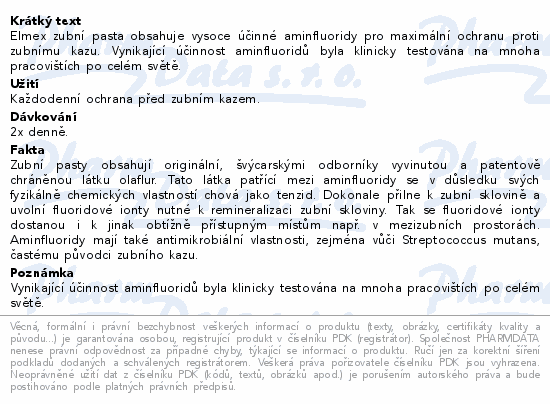 Elmex zubní pasta obsahuje vysoce účinné aminfluoridy pro maximální ochranu proti zubnímu kazu. Vynikající účinnost aminfluoridů byla klinicky testována na mnoha pracovištích po celém světě.
