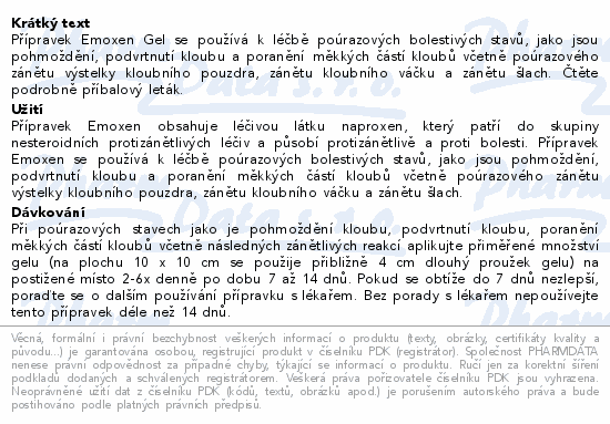 Přípravek Emoxen Gel se používá k léčbě poúrazových bolestivých stavů, jako jsou pohmoždění, podvrtnutí kloubu a poranění měkkých částí kloubů včetně poúrazového zánětu výstelky kloubního pouzdra, zánětu kloubního váčku a zánětu šlach. Čtěte pozorně příbalový leták.