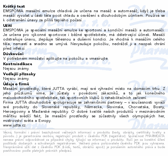 EMSPOMA masážní emulze chladivá Je určena na masáž a automasáž, když je třeba masáží vyvolat u části těla pocit chladu a osvěžení s dlouhodobým účinkem. Používá se k odstranění únavy za příliš teplého počasí.