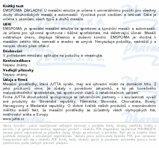 EMSPOMA ZÁKLADNÍ U masážní emulze je určena k univerzálnímu použití pro všechny druhy dlouhodobých masáží a automasáží. Vyvolává pocit osvěžení a lehkosti. Dále je určena k ukončení všech typů a druhů masáže.
