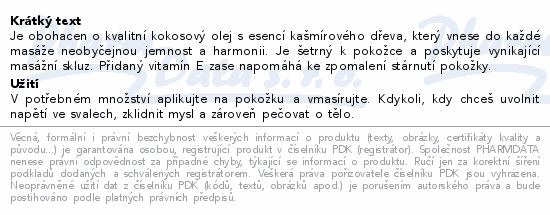 Je obohacen o kvalitní kokosový olej s esencí kašmírového dřeva, který vnese do každé masáže neobyčejnou jemnost a harmonii. Je šetrný k pokožce a poskytuje vynikající masážní skluz. Přidaný vitamín E zase napomáhá ke zpomalení stárnutí pokožky.