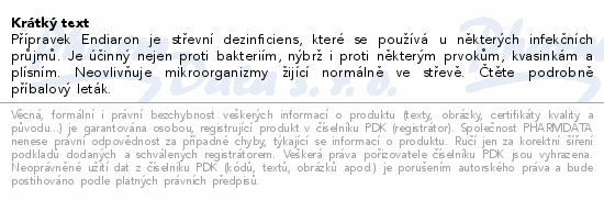Přípravek Endiaron je střevní dezinficiens, které se používá u některých infekčních průjmů. Je účinný nejen proti bakteriím, nýbrž i proti některým prvokům, kvasinkám a plísním. Neovlivňuje mikroorganizmy žijící normálně ve střevě. Čtěte pozorně příbalový leták.
