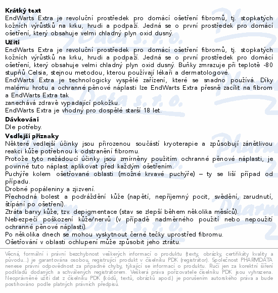 EndWarts Extra je revoluční prostředek pro domácí ošetření fibromů, tj. stopkatých kožních výrůstků na krku, hrudi a podpaží. Jedná se o první prostředek pro domácí ošetření, který obsahuje velmi chladný plyn oxid dusný.