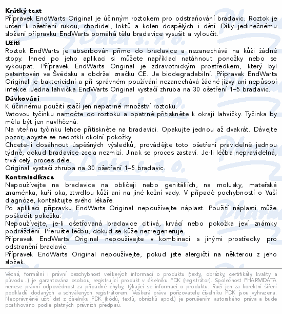 Přípravek EndWarts Original je účinným roztokem pro odstraňování bradavic. Roztok je určen k ošetření rukou, chodidel, loktů a kolen dospělých i dětí. Díky jedinečnému složení přípravku EndWarts pomáhá tělu bradavice vysušit a vyloučit.
