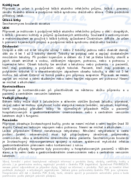 Přípravek Enterol je určen k podpůrné léčbě akutního infekčního průjmu, k léčbě i prevenci zánětu tlustého střeva provázeného průjmy v souvislosti s užíváním antibiotik. Obsahuje jako léčivou látku mikroorganismus Saccharomyces boulardii kmen CNCM I-745, který patří do skupiny protiprůjmových mikroorganismů.