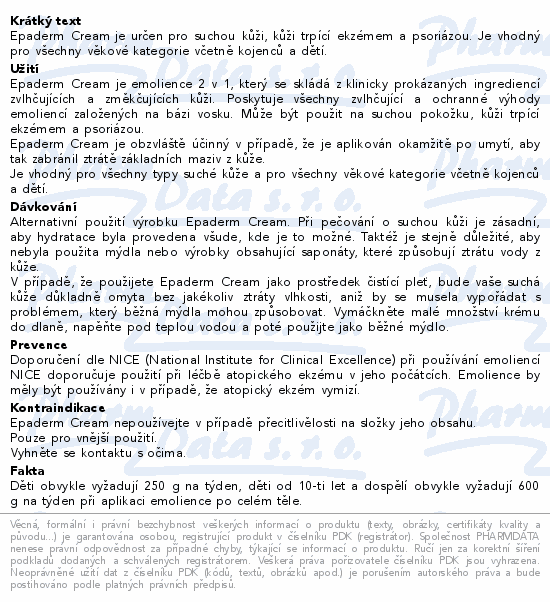 Epaderm Cream je určen pro suchou kůži, kůži trpící ekzémem a psoriázou. Je vhodný pro všechny věkové kategorie včetně kojenců a dětí.