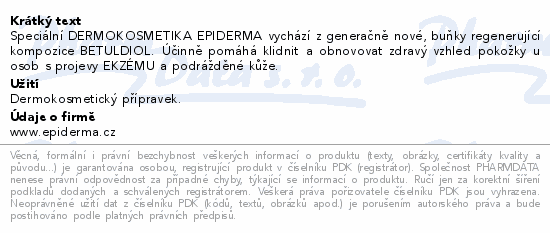 Speciální DERMOKOSMETIKA EPIDERMA vychází z generačně nové, buňky regenerující kompozice BETULDIOL. Účinně pomáhá klidnit a obnovovat zdravý vzhled pokožky u osob s projevy EKZÉMU a podrážděné kůže.