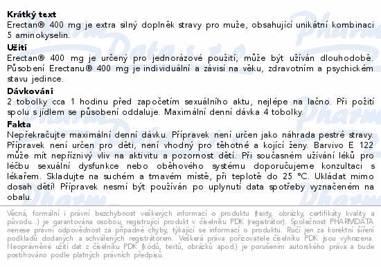 Erectan je doplněk stravy ve formě tobolek. Obsahuje unikátní kombinaci 5 aminokyselin: L-arginin alfa-ketoglutarát, L-ornitin alfa-ketoglutarát, L-arginine base, L-citrulin, L-lysin HCI. Aminokyselina Arginin, která je součástí většiny známých přípravků pro muže, je u Erectan 400 mg již v nové, speciálně upravené formě L-Arginine alpha-ketoglutarate.