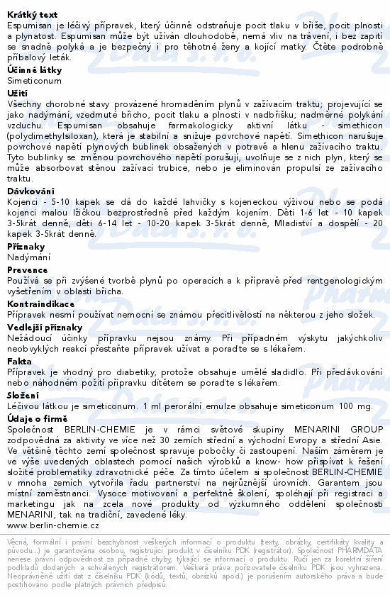 Espumisan je léčivý přípravek, který účinně odstraňuje pocit tlaku v břiše, pocit plnosti a plynatost. Espumisan může být užíván dlouhodobě, nemá vliv na trávení, i bez zapití se snadně polyká a je bezpečný i pro těhotné ženy a kojící matky. Čtěte pozorně příbalový leták.