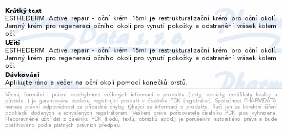 ESTHEDERM Active repair - oční krém 15ml je restrukturalizační krém pro oční okolí. Jemný krém pro regeneraci očního okolí pro vynutí pokožky a odstranění vrásek kolem očí.