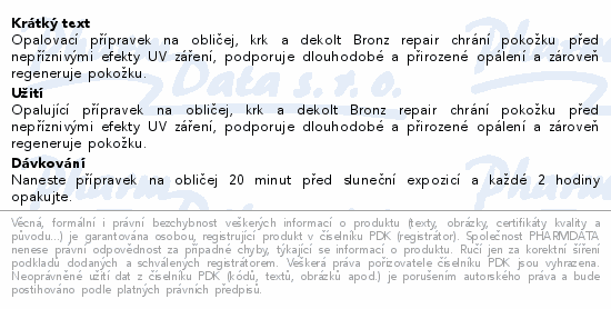 Opalovací přípravek na obličej, krk a dekolt Bronz repair chrání pokožku před nepříznivými efekty UV záření, podporuje dlouhodobé a přirozené opálení a zároveň regeneruje pokožku.