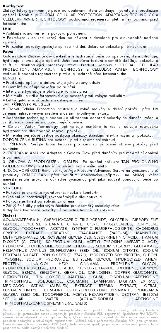 Zlatavý tělový gel-krém je péče po opalování, která uklidňuje, hydratuje a prodlužuje opálení. Kombinuje GLOBAL CELLULAR PROTECTION, ADAPTASUN TECHNOLGY a CELLULAR WATER TECHNOLOGY podporující regeneraci pleti a její ochranu před fotostárnutím.