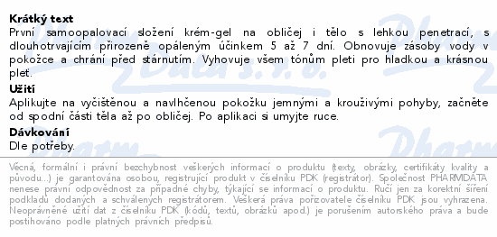 První samoopalovací složení krém-gel na obličej i tělo s lehkou penetrací, s dlouhotrvajícím přirozeně opáleným účinkem 5 až 7 dní. Obnovuje zásoby vody v pokožce a chrání před stárnutím. Vyhovuje všem tónům pleti pro hladkou a krásnou pleť.