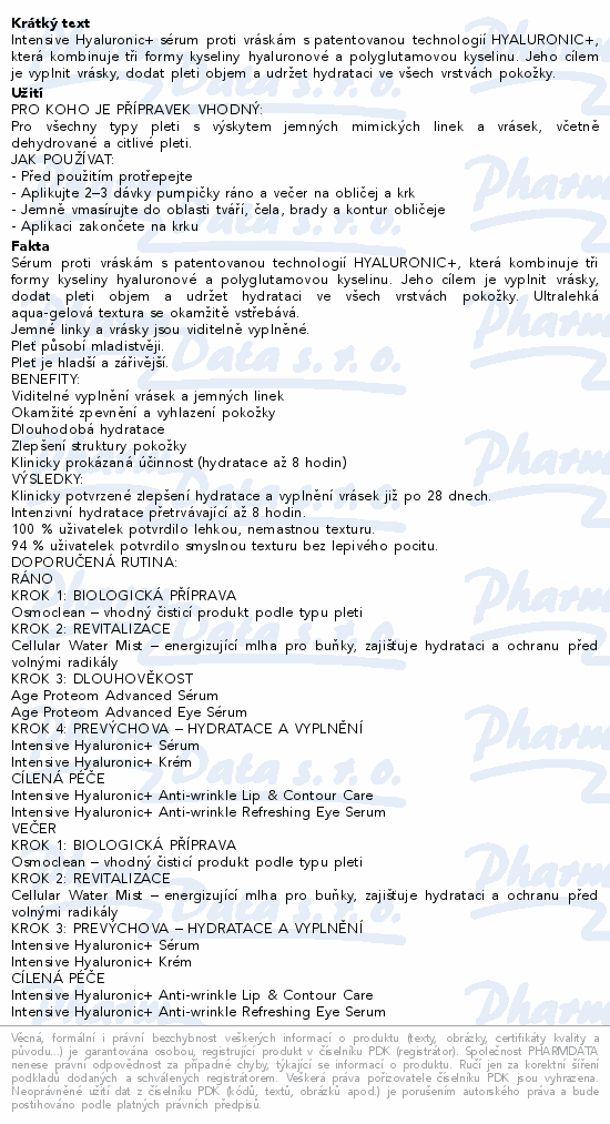 Intensive Hyaluronic+ sérum proti vráskám s patentovanou technologií HYALURONIC+, která kombinuje tři formy kyseliny hyaluronové a polyglutamovou kyselinu. Jeho cílem je vyplnit vrásky, dodat pleti objem a udržet hydrataci ve všech vrstvách pokožky.