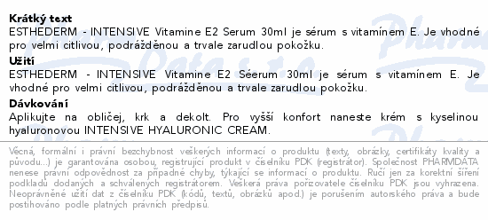 ESTHEDERM - INTENSIVE Vitamine E2 Serum 30ml je sérum s vitamínem E. Je vhodné pro velmi citlivou, podrážděnou a trvale zarudlou pokožku.
