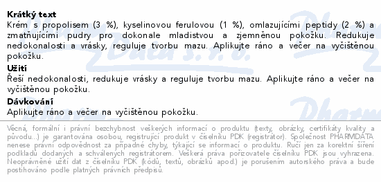 Krém s propolisem (3 %), kyselinovou ferulovou (1 %), omlazujícími peptidy (2 %) a zmatňujícími pudry pro dokonale mladistvou a zjemněnou pokožku. Redukuje nedokonalosti a vrásky, reguluje tvorbu mazu. Aplikujte ráno a večer na vyčištěnou pokožku.