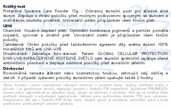 Protective Sunshine Care Powder 15g - Ochranný sluneční pudr pro středně silné slunce. Zlepšuje a chrání pokožku před možnými poškozeními spojenými se sluncem a znečištěním okolního prostředí. Univerzální odstín přizpůsoben všem tónům pleti.