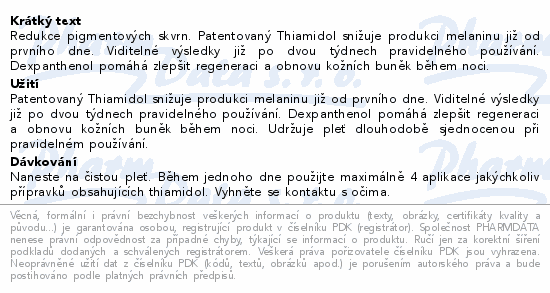 Redukce pigmentových skvrn. Patentovaný Thiamidol snižuje produkci melaninu již od prvního dne. Viditelné výsledky již po dvou týdnech pravidelného používání. Dexpanthenol pomáhá zlepšit regeneraci a obnovu kožních buněk během noci.